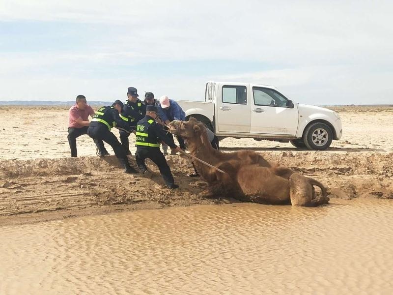 無獨有偶。當(dāng)日下午,阿拉善左旗蘇宏圖邊境派出所也接到群眾報警:稱其一峰駱駝陷入泥潭無法脫身,請求救助。民警趕到現(xiàn)場后發(fā)現(xiàn)這是一峰懷孕母駝,在飲水時不慎滑入泥潭,由于浸泡許久,已經(jīng)無法站立。民警當(dāng)即采取措施,在避免肚子受傷害的前提下,將兩條繩子分別固定在駱駝前肢與后肢,再利用人力拖拽,經(jīng)過2個小時的救援,成功將母駝救出。(牛鑫 梁鎮(zhèn) 于鶴偉)