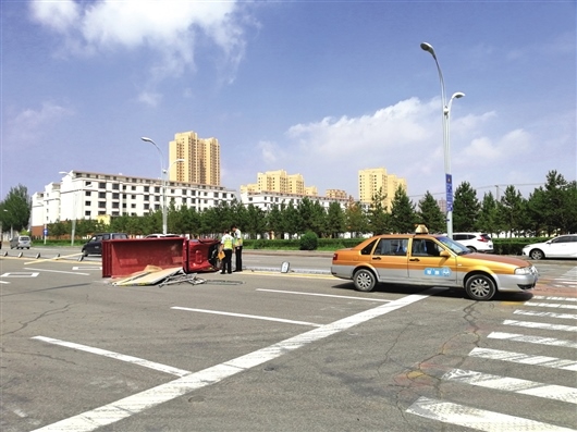 出租車駕駛員弓先生告訴記者:“當(dāng)時(shí)我駕車從北向南行駛,車上有一名乘客坐在副駕駛位置,正在此處停車等待掉頭時(shí),后面的三輪車撞了上來,當(dāng)時(shí)撞擊的力度很大,把我的車撞出了線,三輪車側(cè)翻也撞倒了護(hù)欄?!惫壬f事故發(fā)生后乘客自行離開。三輪摩托車駕駛員姜先生身上多處擦傷,他說當(dāng)時(shí)車上只有他一人,也是北向南行駛。姜先生說:“車上拉載的都是裝修用具和材料,事故發(fā)生時(shí)有些蒙?!?/p>