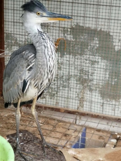 經(jīng)有經(jīng)驗(yàn)的民警辨認(rèn),這是一只蒼鷺幼鳥。這只鳥身高約70公分,長(zhǎng)長(zhǎng)的尖嘴,身著灰色體羽,頭戴深灰色羽冠,兩條大長(zhǎng)腿格外顯眼,白色的前頸縱向排列著黑灰色條紋。民警聯(lián)系獸醫(yī)為其做了體檢,經(jīng)檢查,這只鳥并無傷病,可能是由于剛出窩飛行能力不強(qiáng)、捕食能力不足,造成體力虛弱。民警買來小魚,只見這只鳥狼吞虎咽享用起來,不久便精神十足,開始啄民警??吹剿w力開始恢復(fù),民警懸著的心也就放下了。民警計(jì)劃選擇合適時(shí)間和地方將其放飛。
