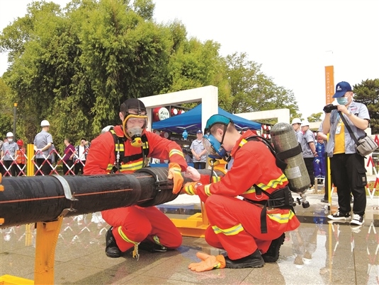 陣陣白煙模擬的是道路中壓燃氣管道泄漏,接到報警后,119消防指揮中心第一時間通過應(yīng)急聯(lián)絡(luò)系統(tǒng)通知住建部門和燃氣企業(yè)到場處置,同時消防救援力量到達現(xiàn)場對泄漏點進行處置。接到通知后,中浩燃氣公司搶修及應(yīng)急處置人員到達現(xiàn)場,對泄漏區(qū)域20米范圍內(nèi)進行圍擋警戒,并攜帶可燃氣體檢測儀對周邊環(huán)境進行檢測,以防人員受傷,保證作業(yè)安全。應(yīng)急處置人員佩戴空氣呼吸器進入現(xiàn)場,確定漏點及管道尺寸,用膠帶對漏點進行臨時處理,加裝管道抱卡,臨時封堵管道?,F(xiàn)場指揮人員根據(jù)處置情況,集結(jié)隊伍,利用運行不停輸維修設(shè)備進行管道維修。這一連串的操作下來,泄漏點被及時修好。負責(zé)此次演練的內(nèi)蒙古中浩燃氣有限公司總經(jīng)理賈鵬程介紹,這套不停輸管道維修設(shè)備,既節(jié)約了成本,又能保證安全供氣,能更好地服務(wù)保障廣大市民群眾。