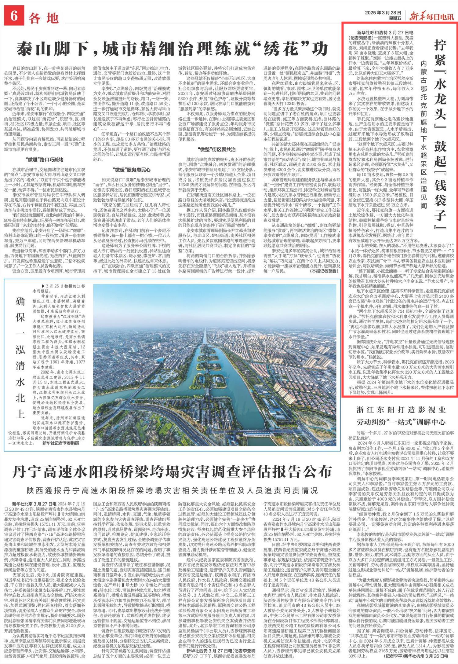 2025年3月28日,《新華每日電訊》第6版刊發(fā)題為《擰緊“水龍頭” 鼓起“錢袋子”》的文章,報(bào)道了內(nèi)蒙古鄂托克前旗通過水澆地置換大棚、推廣節(jié)水作物及滴灌技術(shù),不僅使農(nóng)戶收入增長(zhǎng),還減少了地下水的開采和使用。根據(jù)2024年第四季度地下水的水位變化情況通報(bào)顯示,敖勒召其、三段地兩個(gè)地下水超采區(qū),整體扭轉(zhuǎn)地下水位下降趨勢(shì),實(shí)現(xiàn)止降回升。