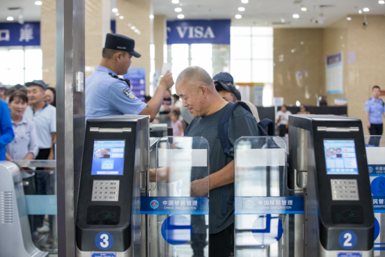 二連出入境邊防檢查站移民管理警察正在對(duì)夜間出境列車進(jìn)行查驗(yàn)。郭鵬杰 攝