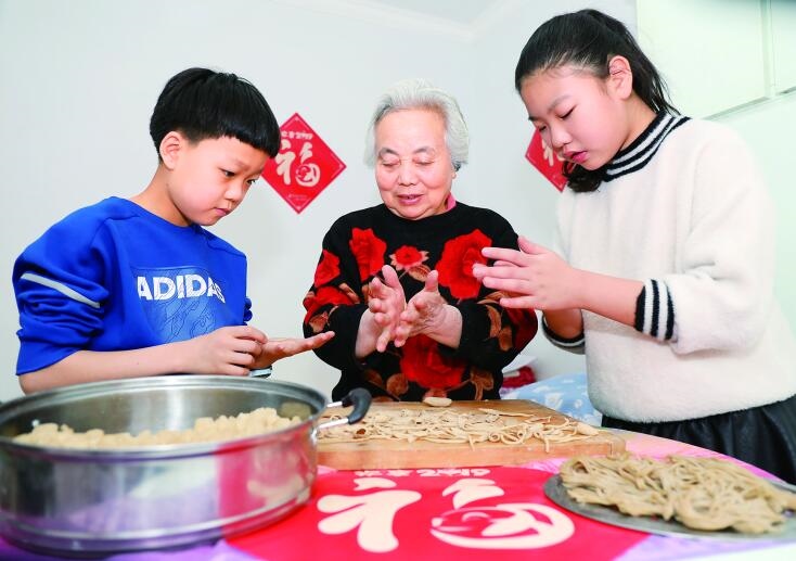 2月13日,呼和浩特市市民李月珍老人教小朋友們搓莜面。在蒙晉地區(qū),正月初十有老鼠娶親要吃莜面的習(xí)俗,為此,家家吃莜面的傳統(tǒng)延續(xù)至今。搓完莜面,蒸莜面,寓意搓去災(zāi)病,蒸蒸日上。