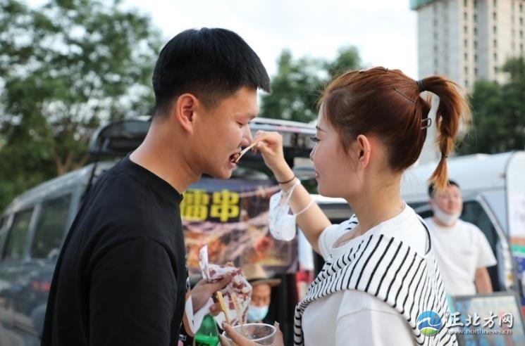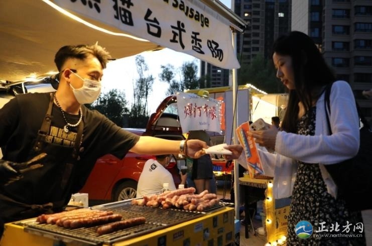 人間煙火氣,最撫凡人心。雖然已是21時(shí)許,但是后備廂集市依然人頭攢動(dòng),熱鬧非凡,叫賣聲不絕于耳。一家烤腸攤位前,攤主郭浩楠一邊招呼食客,一邊拿著夾子不緊不慢地翻動(dòng)著烤架上的烤腸,烤好后拿竹簽一穿,伴著滋滋作響的聲音,紅光透亮的烤腸瞬間香氣四溢?!耙呀?jīng)參加了好幾場了,一晚上能售出近百根烤腸,不過我的初衷不是為了賺錢,就是想把自己鐘情的美食分享給大家。”郭浩楠說。