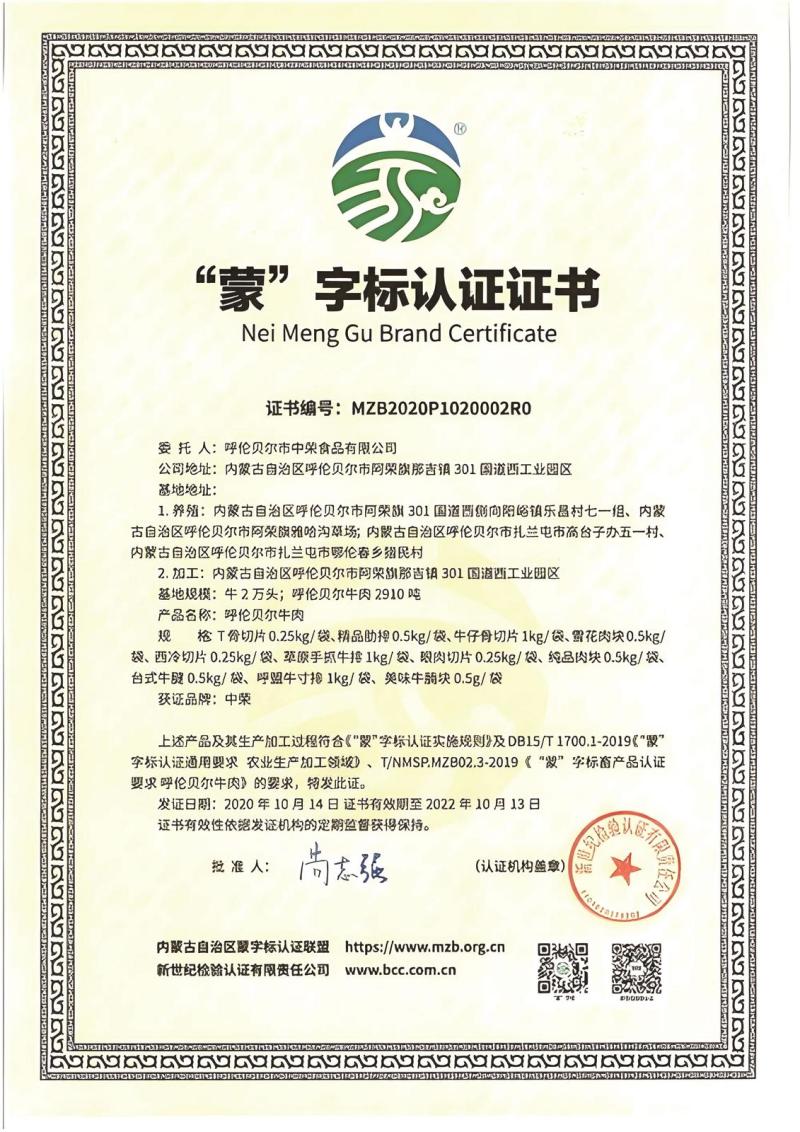 呼倫貝爾市中榮食品有限公司“蒙”字標認證證書