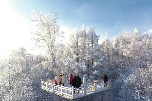 冬天的阿爾山,千里冰封,萬(wàn)里雪飄,呈現(xiàn)出一片純凈無(wú)瑕的白雪世界。晶瑩剔透的霧凇裝點(diǎn)其間,宛如冰雪童話。藍(lán)天映襯下,霧凇閃耀著銀白光芒,群山峻嶺被冰封玉塑,更有一道彩虹橫跨山巔,美不勝收。木棧道深入森林,所見(jiàn)皆是雪與霧凇交織的白茫茫景象。漫步其間,穿越過(guò)膝積雪,那玉樹(shù)瓊花、銀光閃爍的壯美雪景讓人流連忘返。 (記者 畢力格 攝)