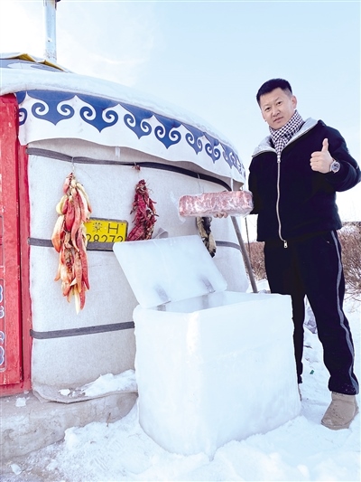 12月8日,記者幾經(jīng)周折與視頻中的小伙張智磊取得了聯(lián)系。張智磊今年36歲,從小在錫林郭勒大草原長大,在當(dāng)?shù)刂饕雠Q蛉馍?。對于意外走紅,張智磊直言自己也沒有想到?!耙曨l是在錫林浩特市南郊向陽村叔叔家院子里的蒙古包拍攝的。記得小時(shí)候,每到冬天,周邊牧民都是把食物埋在雪地里儲存。我前幾天也拍了一個(gè)從雪地里找羊腿的視頻,有粉絲留言‘放在雪地里會不會忘記位置容易丟了’,然后我就突發(fā)奇想,干脆做個(gè)‘冰箱’把年貨放進(jìn)去。”張智磊告訴記者,他從12月3日開始凍冰塊,12月4日把凍結(jié)實(shí)的冰塊拿出來用冷水黏合,因?yàn)楸鶋K低于0攝氏度,遇水就會瞬間黏在一起,然后開始著手打磨,棱棱角角都用電熨斗熨平整,再加上蓋,一個(gè)“冰箱”就完成了。