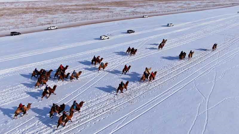在冰雪覆蓋的草原上,成年駱駝10公里比賽、駱駝選美及128名青壯年搏克賽、射箭比賽等10余項(xiàng)賽事逐一上演,扮靚了寂靜的冬日草原。