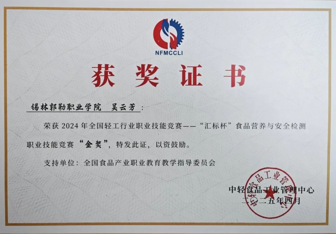 2025年4月21日,由中國輕工業(yè)聯(lián)合會(huì)、中輕食品工業(yè)管理中心、全國食品產(chǎn)業(yè)職業(yè)教育教學(xué)指導(dǎo)委員會(huì)等聯(lián)合舉辦的2024年全國輕工行業(yè)職業(yè)技能競賽——“匯標(biāo)杯”食品營養(yǎng)與安全檢測職業(yè)技能競賽總決賽在廣州圓滿落幕。錫林郭勒職業(yè)學(xué)院食品檢測中心總工程師吳云芳同志榮獲金獎(jiǎng)?! ?/p>