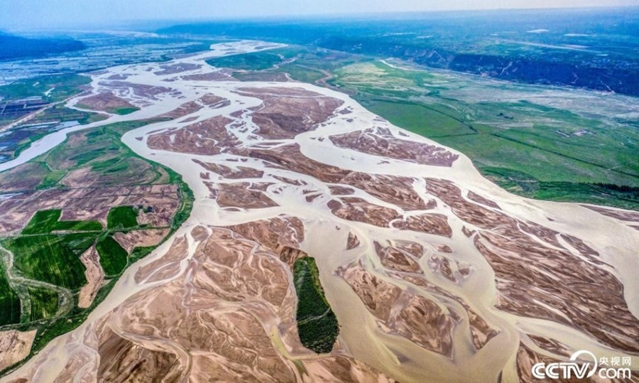 隨著黃河水位下降,山西運城萬榮縣境內的黃河河床大面積裸露,河水在主河道上分散成了無數條大小不等的細流,形成了黃河特有的景色。
