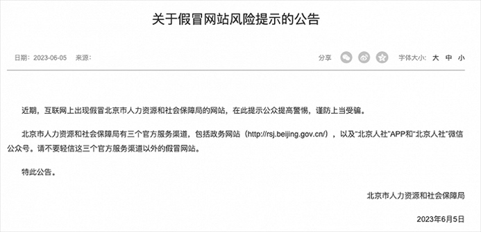·北京人社局就近期出現(xiàn)假冒網(wǎng)站發(fā)布風(fēng)險提示。