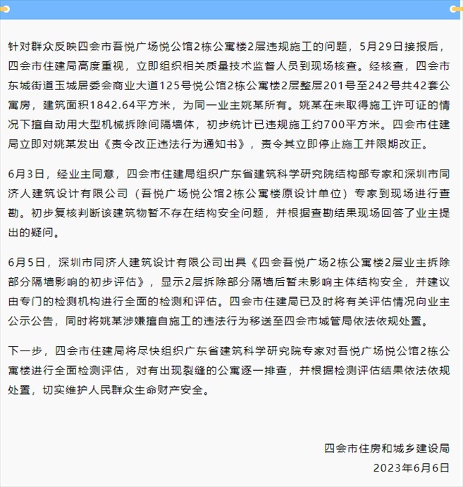 ·業(yè)主買42套房欲打通全部墻體,當(dāng)?shù)赝▓?bào):責(zé)令其立即停止施工并限期改正。