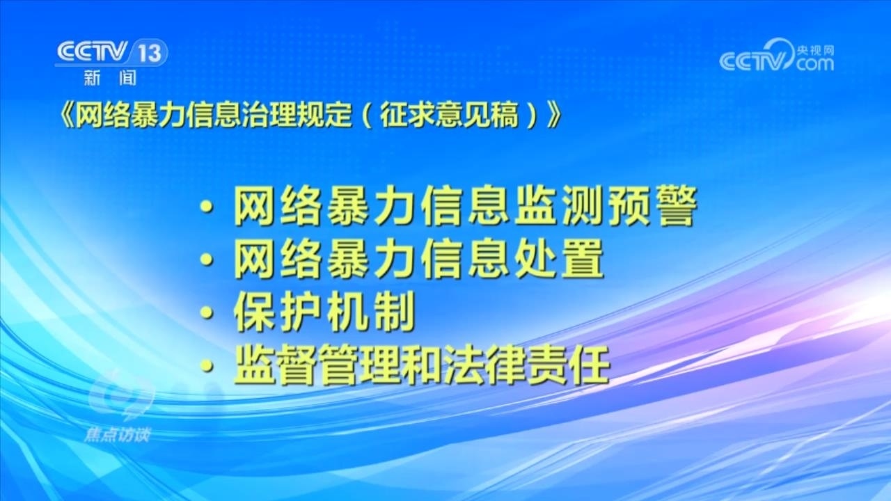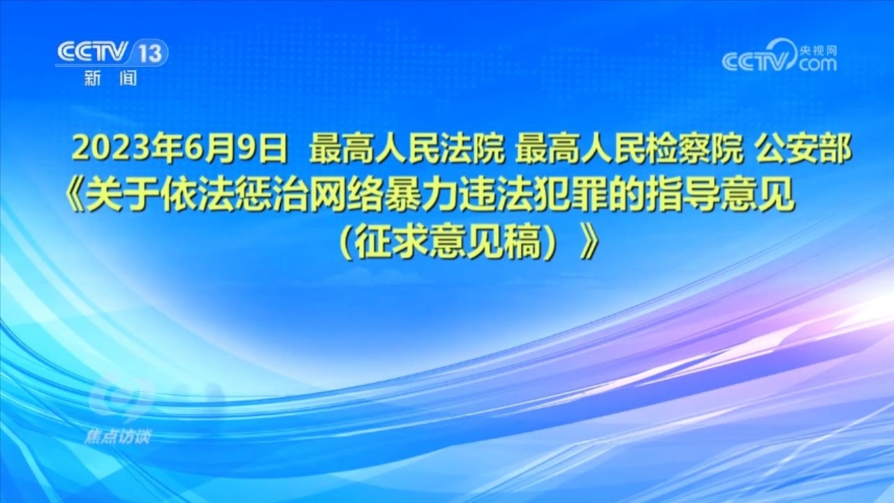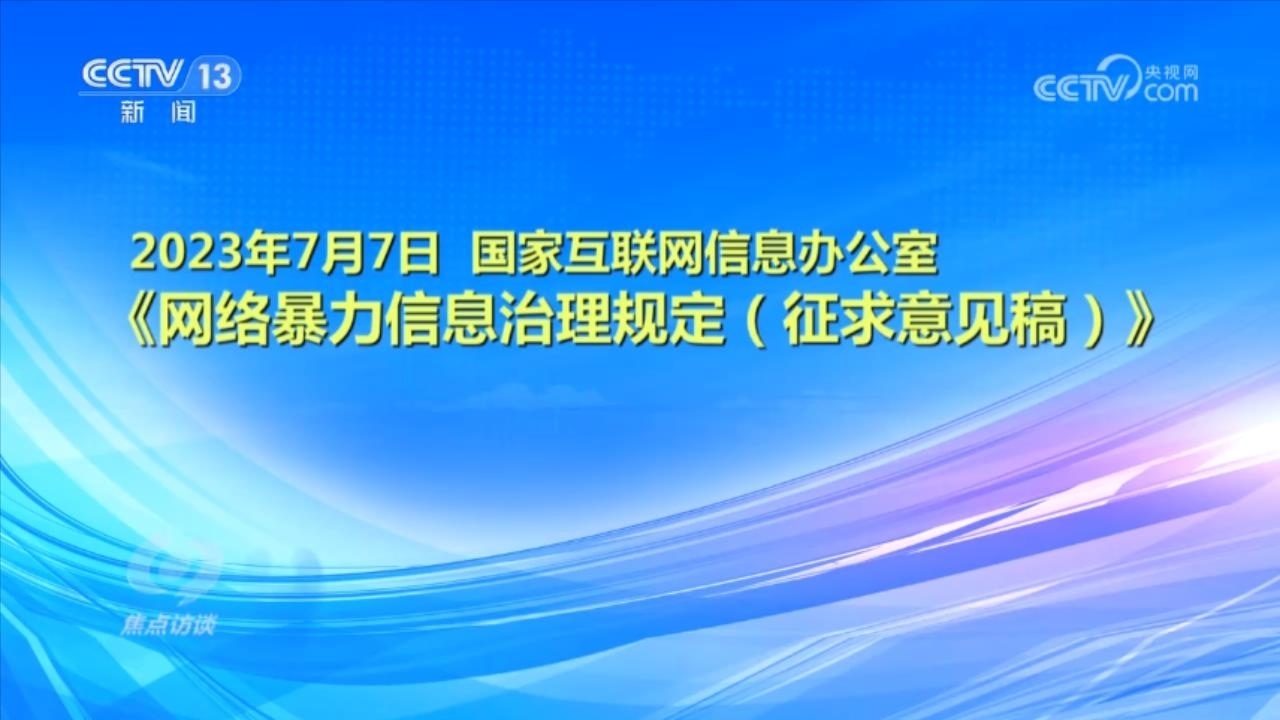 央視網(wǎng)消息(焦點(diǎn)訪談):俗話說(shuō)“舌上有龍泉,殺人不見(jiàn)血”。網(wǎng)絡(luò)暴力不同于現(xiàn)實(shí)中的拳腳相加,但是這些在網(wǎng)絡(luò)空間中用文字、圖片等方式進(jìn)行的傷害和侮辱,一樣可以對(duì)當(dāng)事人的現(xiàn)實(shí)生活產(chǎn)生惡劣的影響,讓當(dāng)事人的心靈“流血”。在傷害當(dāng)事人的同時(shí),網(wǎng)絡(luò)暴力行為也嚴(yán)重污染了互聯(lián)網(wǎng)環(huán)境,影響社會(huì)和諧穩(wěn)定。近日,國(guó)家互聯(lián)網(wǎng)信息辦公室起草了《網(wǎng)絡(luò)暴力信息治理規(guī)定(征求意見(jiàn)稿)》,向社會(huì)公開(kāi)征求意見(jiàn);同樣是針對(duì)網(wǎng)絡(luò)暴力,在6月,最高人民法院、最高人民檢察院、公安部起草了《關(guān)于依法懲治網(wǎng)絡(luò)暴力違法犯罪的指導(dǎo)意見(jiàn)(征求意見(jiàn)稿)》,面向社會(huì)公開(kāi)征求意見(jiàn)。治理網(wǎng)絡(luò)暴力這顆“毒瘤”,營(yíng)造良好生態(tài)勢(shì)在必行。