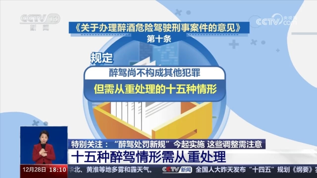 央視網(wǎng)消息:12月28日開始,《關(guān)于辦理醉酒危險駕駛刑事案件的意見》,俗稱“醉駕處罰新規(guī)”正式實(shí)施。此前,《意見》由最高人民法院、最高人民檢察院、公安部、司法部聯(lián)合發(fā)布。