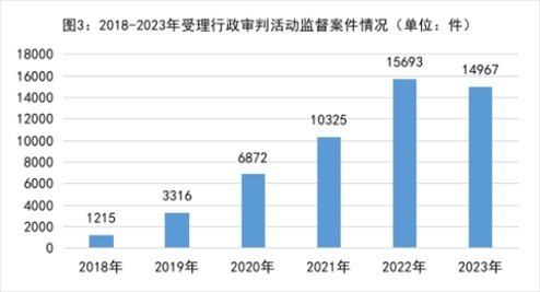 3.行政審判活動(dòng)監(jiān)督更有實(shí)效。2018年以來受理行政審判活動(dòng)監(jiān)督案件分別是:2018年1215件、2019年3316件、2020年6872件、2021年10325件、2022年15693件,年均增加89.6%。經(jīng)過連續(xù)五年監(jiān)督,監(jiān)督效果初步體現(xiàn)。2023年共受理14967件,同比下降4.6%。其中,依職權(quán)受理占95.5%;依申請受理占4.5%。針對超期立案、超期審理、違反規(guī)定送達(dá)法律文書等審判程序違法問題,向法院提出檢察建議13491件,同比下降6.8%。