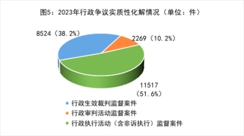 5.行政爭議實(shí)質(zhì)性化解持續(xù)深化做實(shí)。針對司法實(shí)踐中一些行政案件程序已結(jié)但訟爭未解的“程序空轉(zhuǎn)”“案結(jié)事不了”等問題,2023年共促進(jìn)案涉行政爭議實(shí)質(zhì)性化解22310件,同比上升26%。其中,行政生效裁判監(jiān)督案件8524件,占38.2%;行政審判活動(dòng)監(jiān)督案件2269件,占10.2%;行政執(zhí)行活動(dòng)(含非訴執(zhí)行)監(jiān)督案件11517件,占51.6%。