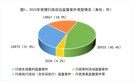 1.行政檢察監(jiān)督職能全面發(fā)展。一方面,訴訟內(nèi)監(jiān)督進(jìn)一步強(qiáng)化。2023年全國檢察機(jī)關(guān)共受理行政訴訟監(jiān)督案件79209件,其中,行政生效裁判監(jiān)督案件24975件,占比31.5%;行政審判活動(dòng)監(jiān)督案件14967件,占比18.9%;行政執(zhí)行活動(dòng)(含非訴執(zhí)行)監(jiān)督案件35933件,占比45.4%;行政類案監(jiān)督等案件3334件,占比4.2%。另一方面,“訴訟外”監(jiān)督實(shí)現(xiàn)新突破。2023年辦理行刑反向銜接案件中對被不起訴人應(yīng)受行政處罰的提出檢察意見11.3萬人,辦理行政違法行為監(jiān)督案件提出檢察建議3.2萬件。行政檢察各項(xiàng)職能發(fā)展更加全面、更加協(xié)調(diào)。針對行政訴訟、行政執(zhí)法和執(zhí)行活動(dòng)存在的問題,以抗訴、檢察建議等方式提出監(jiān)督意見17.4萬件。