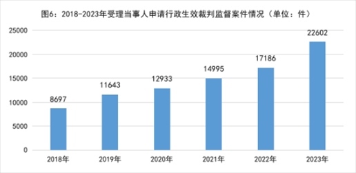 1.依申請監(jiān)督的行政生效裁判監(jiān)督案件數(shù)量逐年上升,反映出人民群眾對檢察監(jiān)督的更高需求。2018年以來當(dāng)事人不服法院生效裁判向檢察機(jī)關(guān)申請監(jiān)督的案件分別是:2018年8697件、2019年11643件、2020年12933件、2021年14995件、2022年17186件、2023年22602件,年均增加21%。2023年16個(gè)省級檢察院受理行政案件數(shù)超過民事案件。當(dāng)事人對裁判結(jié)果申請監(jiān)督的同時(shí),很多情況下還對審判和執(zhí)行程序一并主張?jiān)V求,追求“看得見”的公平正義。