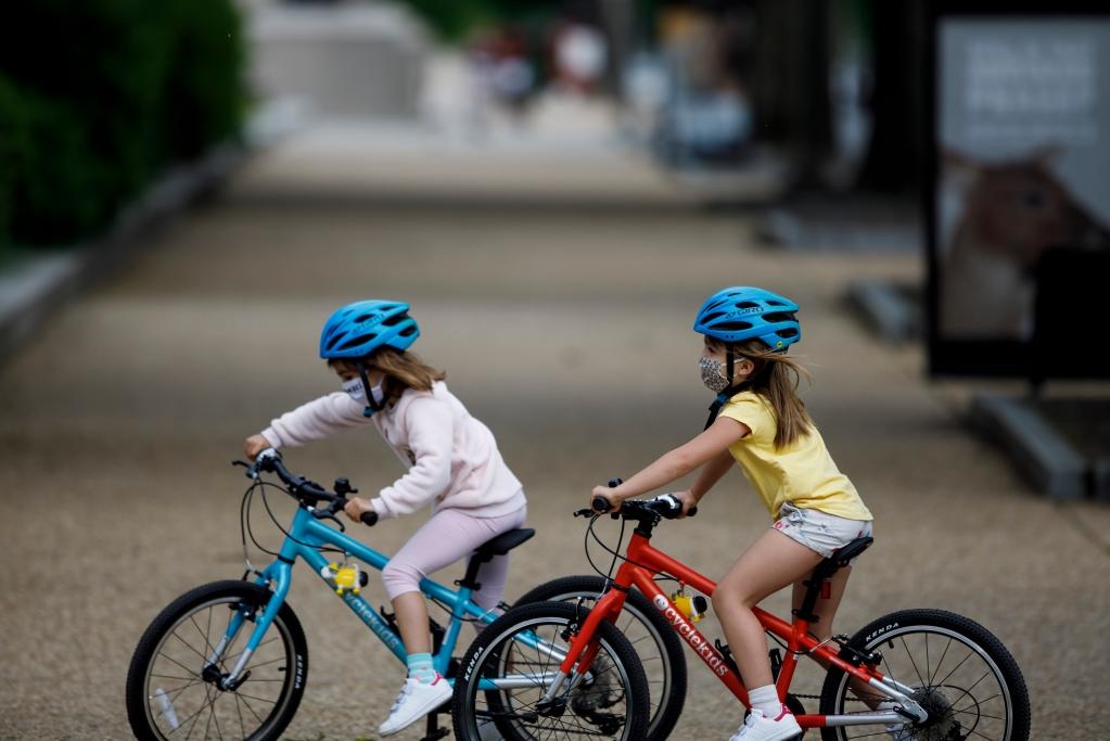 2020年5月18日,兩名兒童戴著口罩在美國(guó)首都華盛頓國(guó)家廣場(chǎng)騎車。新華社發(fā)(沈霆攝)