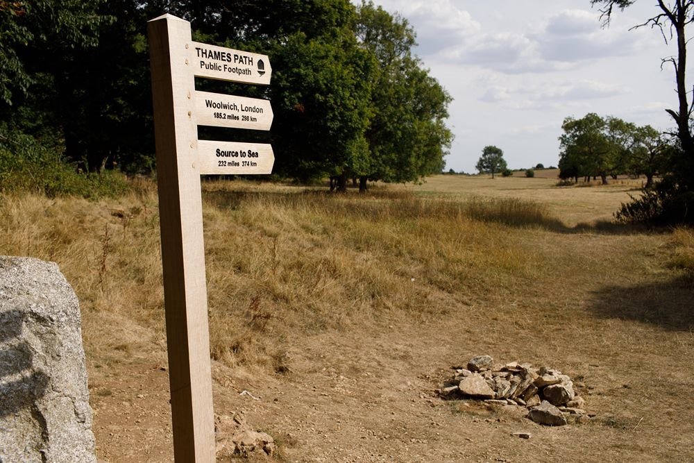 ↑這是8月14日在英國(guó)賽倫塞斯特附近拍攝的干涸的泰晤士河發(fā)源地和一塊寫(xiě)有“泰晤士河起點(diǎn)”的石碑。