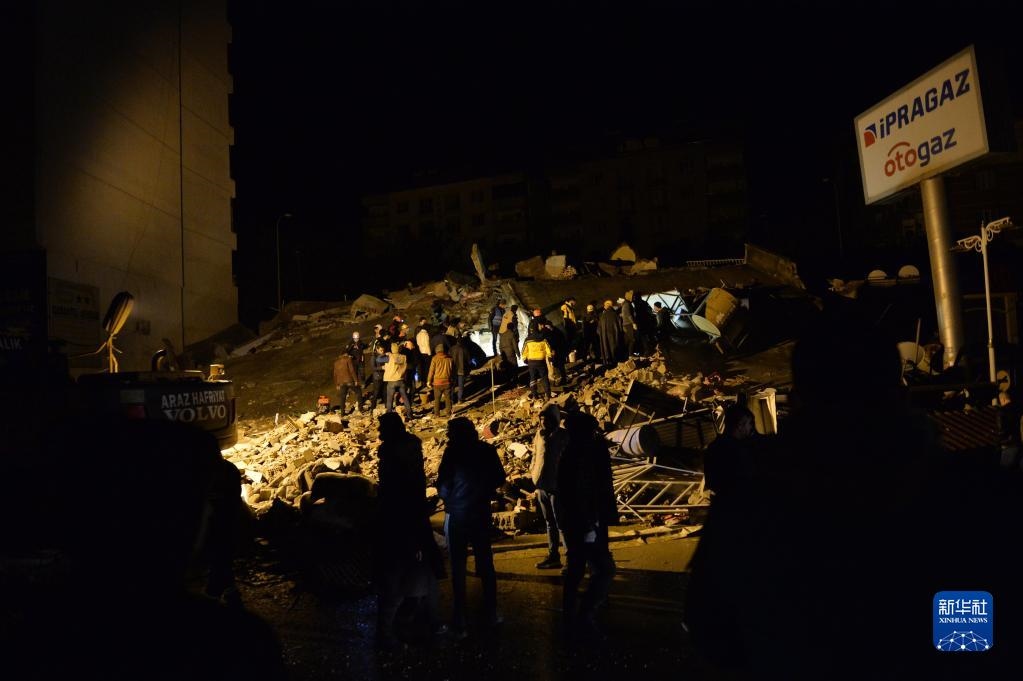 2月6日,救援人員在土耳其南部地震重災區(qū)卡赫拉曼馬拉什省帕扎爾哲克倒塌的建筑中搜尋幸存者。新華社發(fā)(穆斯塔法·卡亞攝)