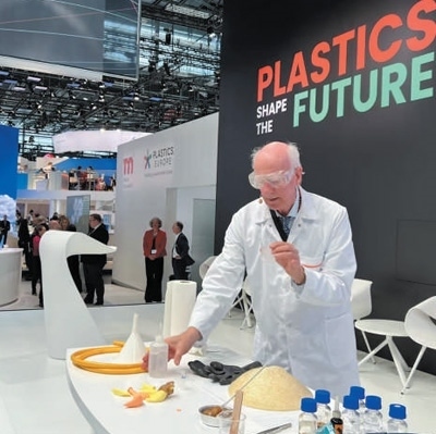 2022年10月20日,在德國(guó)杜塞爾多夫塑料展上展示的可再生塑料和回收技術(shù)。本報(bào)記者 李 強(qiáng)攝