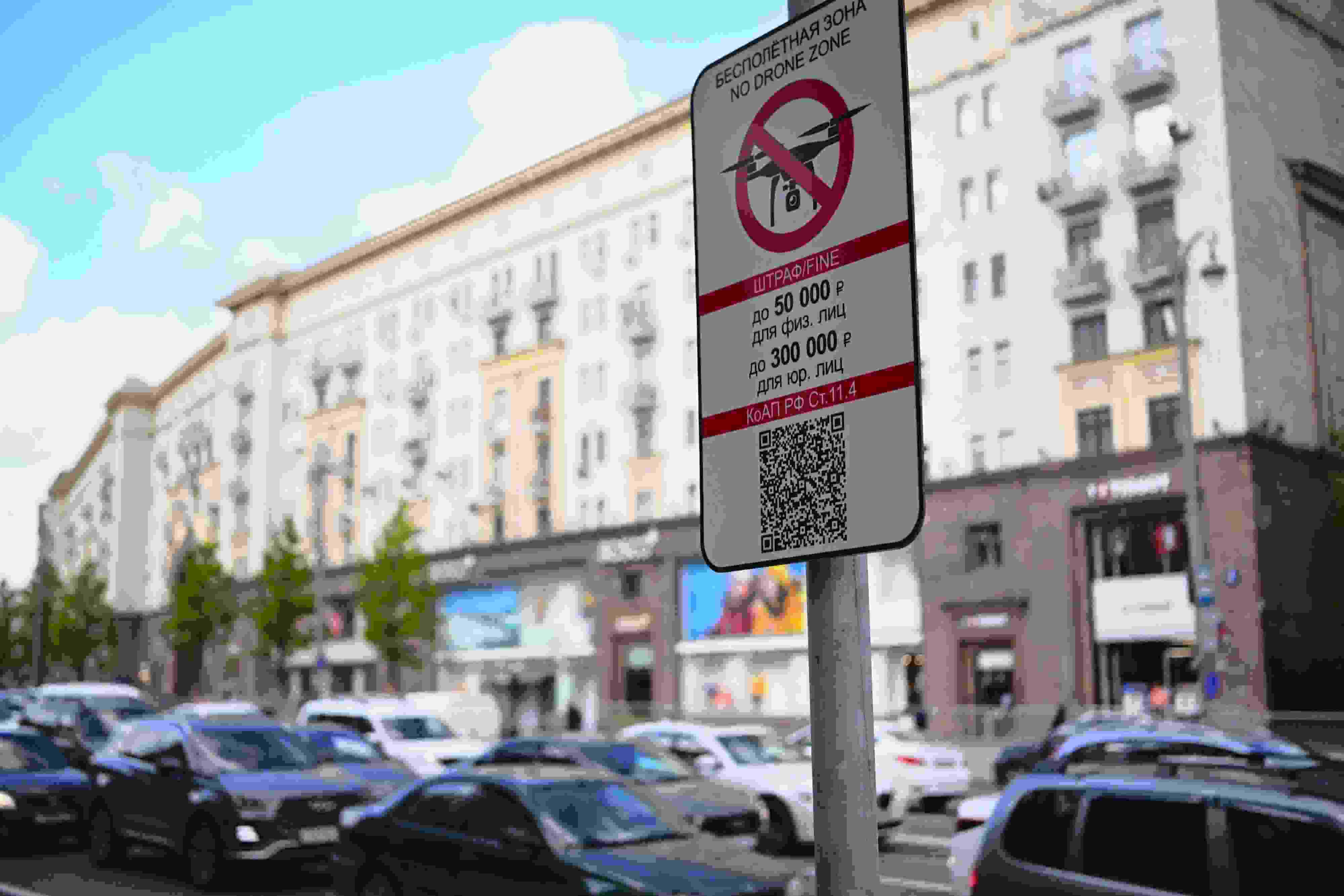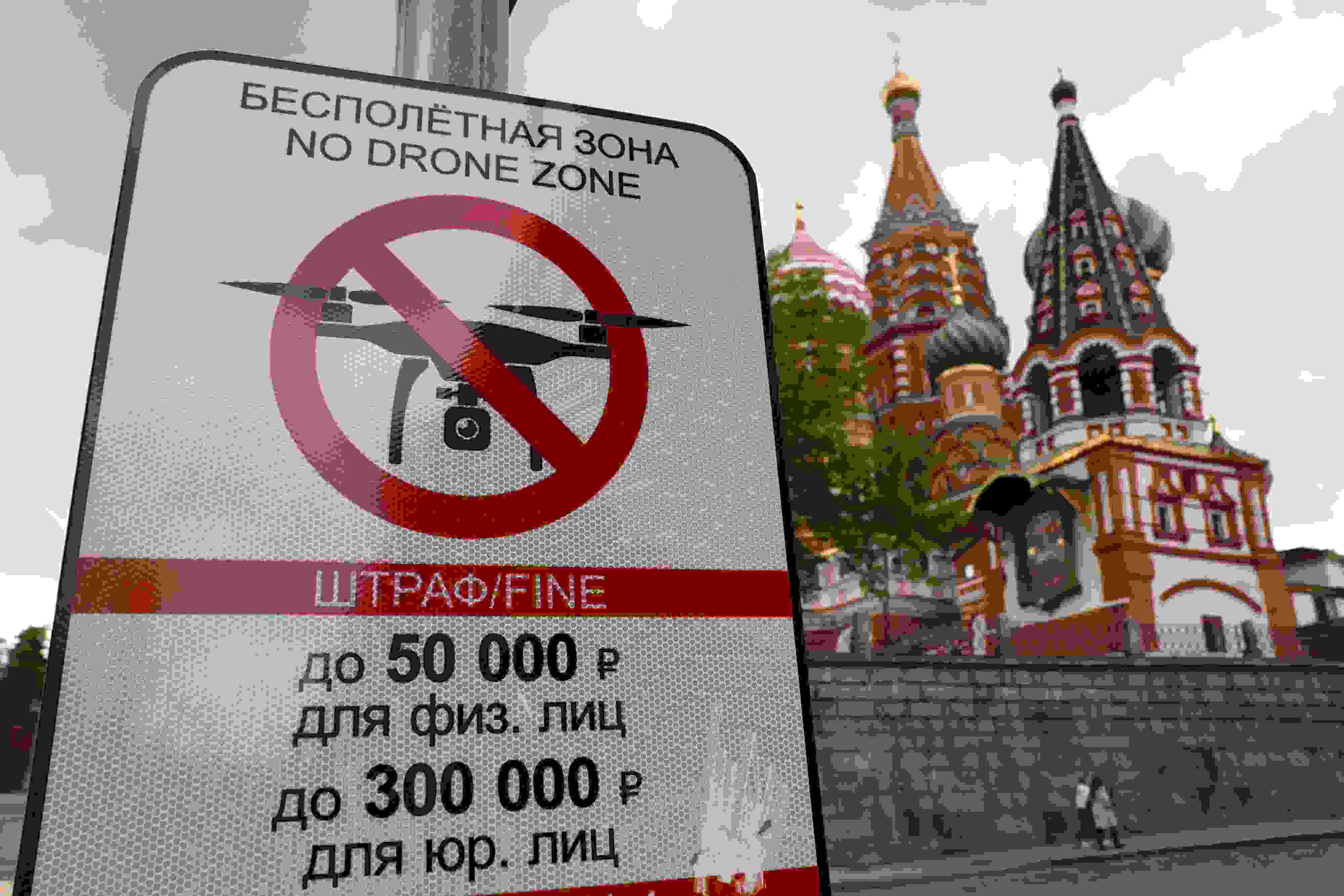 當(dāng)?shù)貢r(shí)間2023年5月3日,俄羅斯莫斯科,莫斯科市中心懸掛的“無(wú)人駕駛飛機(jī)禁飛區(qū)”的標(biāo)志,禁止無(wú)人機(jī)在該地區(qū)飛行??死锬妨謱m遭無(wú)人機(jī)襲擊后,莫斯科市長(zhǎng)宣布禁止未經(jīng)授權(quán)的無(wú)人機(jī)在俄羅斯首都上空飛行。 視覺(jué)中國(guó)
