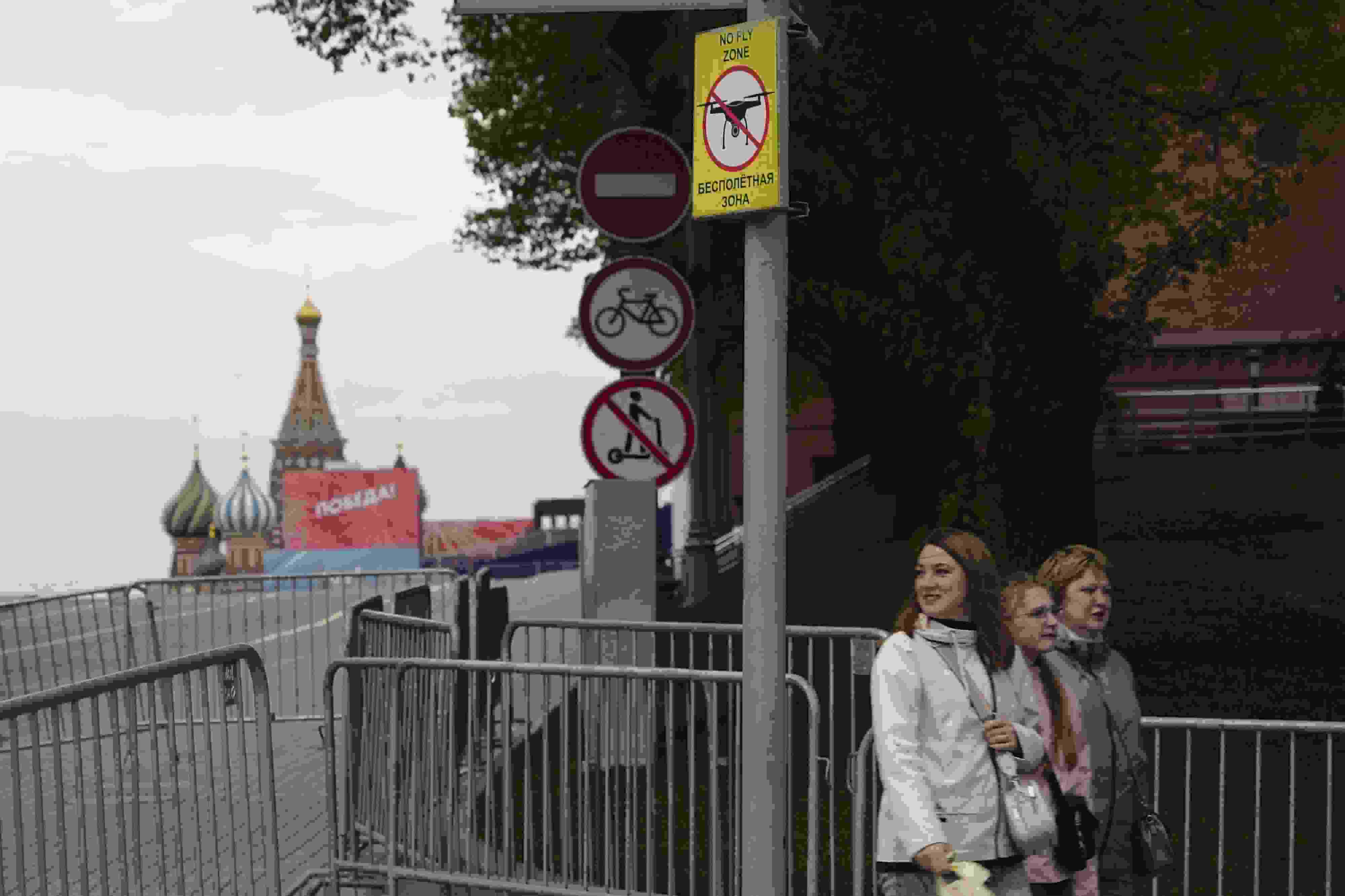 當(dāng)?shù)貢r(shí)間2023年5月3日,俄羅斯莫斯科,莫斯科市中心懸掛的“無(wú)人駕駛飛機(jī)禁飛區(qū)”的標(biāo)志,禁止無(wú)人機(jī)在該地區(qū)飛行。克里姆林宮遭無(wú)人機(jī)襲擊后,莫斯科市長(zhǎng)宣布禁止未經(jīng)授權(quán)的無(wú)人機(jī)在俄羅斯首都上空飛行。 視覺(jué)中國(guó)