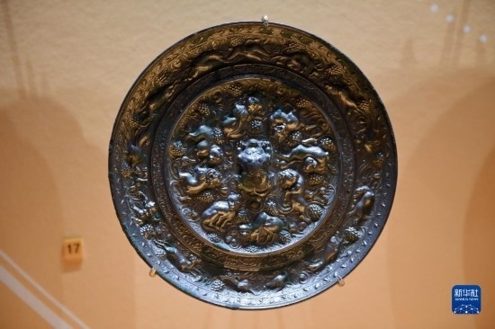 這是在西安博物院展出的唐代瑞獸葡萄紋銅鏡(5月8日攝)。葡萄、苜蓿等農(nóng)作物通過絲綢之路傳入中國(guó)。