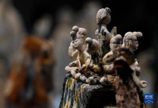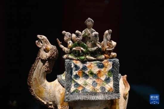 這是在陜西歷史博物館拍攝的唐三彩駱駝?shì)d樂俑(5月11日攝)。這件唐三彩駱駝?shì)d樂俑既是唐代文化藝術(shù)、制作工藝發(fā)達(dá)昌盛的重要物證,也見證了絲綢之路上藝術(shù)的交流與融合。
