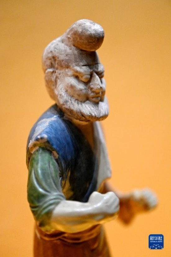 這是在西安博物院展出的唐代三彩胡人牽馬(駝)陶俑(5月8日攝)。唐代的長(zhǎng)安城中居住著大批胡人,胡樂、胡服風(fēng)靡長(zhǎng)安,經(jīng)考古出土的陶俑中有為數(shù)不少的胡人形象。