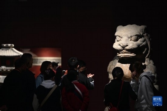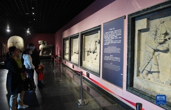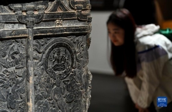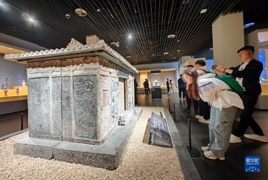 5月8日,游客在西安博物院參觀史君墓石槨。墓主史君是北周涼州薩保,粟特人。石槨整體為中國(guó)傳統(tǒng)歇山頂?shù)钐檬浇ㄖ?,四壁浮雕?nèi)容和風(fēng)格則帶有鮮明的西域特色。