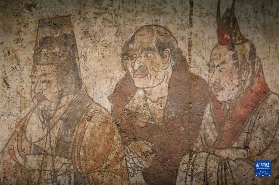這是在陜西歷史博物館拍攝的唐章懷太子墓《客使圖》(局部)(5月11日攝)。《客使圖》描繪的是唐代外交機(jī)構(gòu)鴻臚寺官員接待外國(guó)使節(jié)的場(chǎng)景。