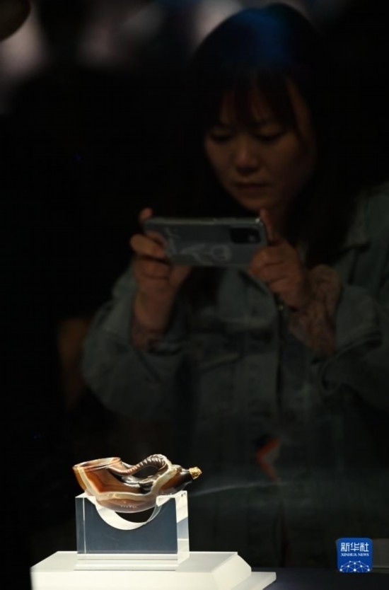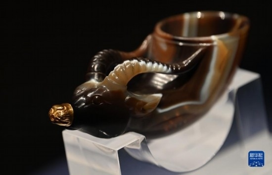5月11日,游客在陜西歷史博物館參觀鑲金獸首瑪瑙杯。鑲金獸首瑪瑙杯的造型,與起源于古希臘的酒具“來通”相似,“來通”曾廣泛流行于中亞、西亞地區(qū),沿著絲綢之路不斷東傳進(jìn)入中國(guó)。