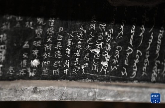 這是在西安博物院展出的史君墓石槨,槨門門楣上用漢文和粟特文刻著墓主墓志(5月8日攝)。墓主史君是北周涼州薩保,粟特人。石槨整體為中國(guó)傳統(tǒng)歇山頂?shù)钐檬浇ㄖ?,四壁浮雕?nèi)容和風(fēng)格則帶有鮮明的西域特色。
