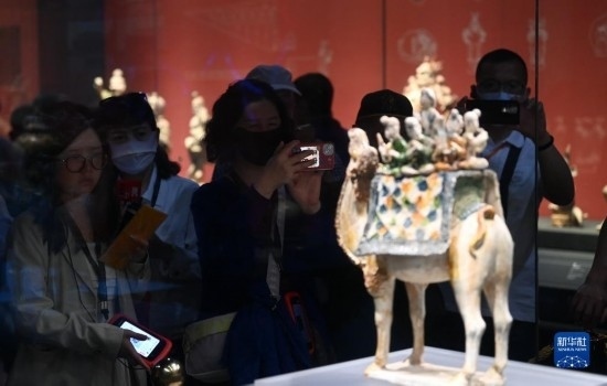 5月11日,游客在陜西歷史博物館參觀唐三彩駱駝?shì)d樂俑。這件唐三彩駱駝?shì)d樂俑既是唐代文化藝術(shù)、制作工藝發(fā)達(dá)昌盛的重要物證,也見證了絲綢之路上藝術(shù)的交流與融合。