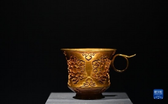 這是在陜西歷史博物館拍攝的掐絲團(tuán)花紋金杯(5月11日攝)。唐代帶把杯除部分器物直接來自中亞粟特,還有部分屬于唐人仿制粟特風(fēng)格的作品,這些物品都是東西方文明通過絲綢之路進(jìn)行交流互鑒的的珍貴物證。
