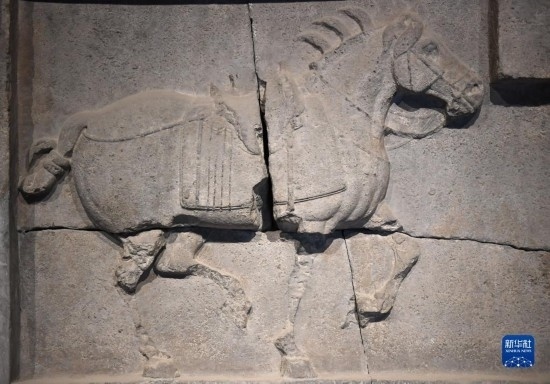 這是在西安碑林博物館內(nèi)拍攝的昭陵六駿石雕特勤驃(5月9日攝)。唐昭陵六駿石刻是為紀(jì)念六匹隨唐太宗李世民征戰(zhàn)疆場(chǎng)的戰(zhàn)馬而刻制的,其中特勤驃等馬匹帶有明顯的西域良馬特征。