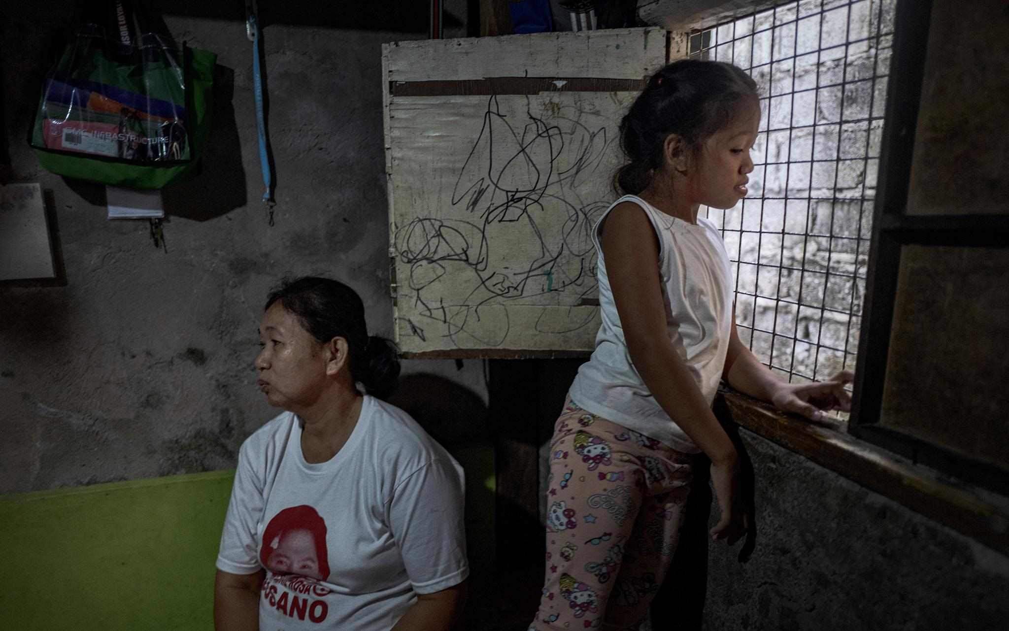 當(dāng)?shù)貢r(shí)間2023年4月15日,菲律賓馬尼拉,奎松市,Corazon Mercado(左)和她的女兒Bea坐在家里。據(jù)Corazon Mercado說:“我們買不起大瓶或散裝的必需品,我們只能買得起小袋的日常必需品?!?/p>