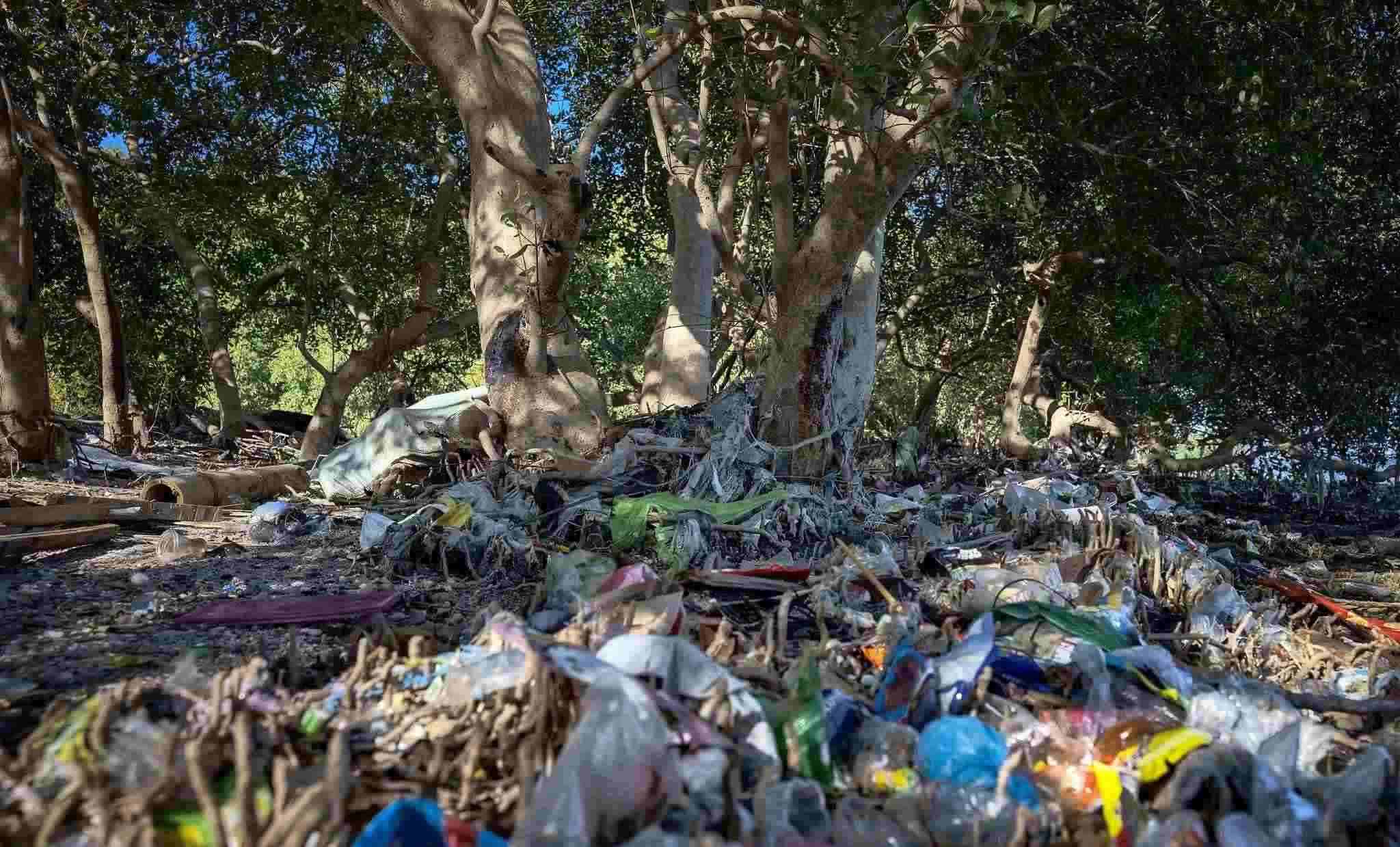 當(dāng)?shù)貢r(shí)間2023年4月19日,菲律賓馬尼拉,帕拉納克,自由島紅樹林上的塑料垃圾。