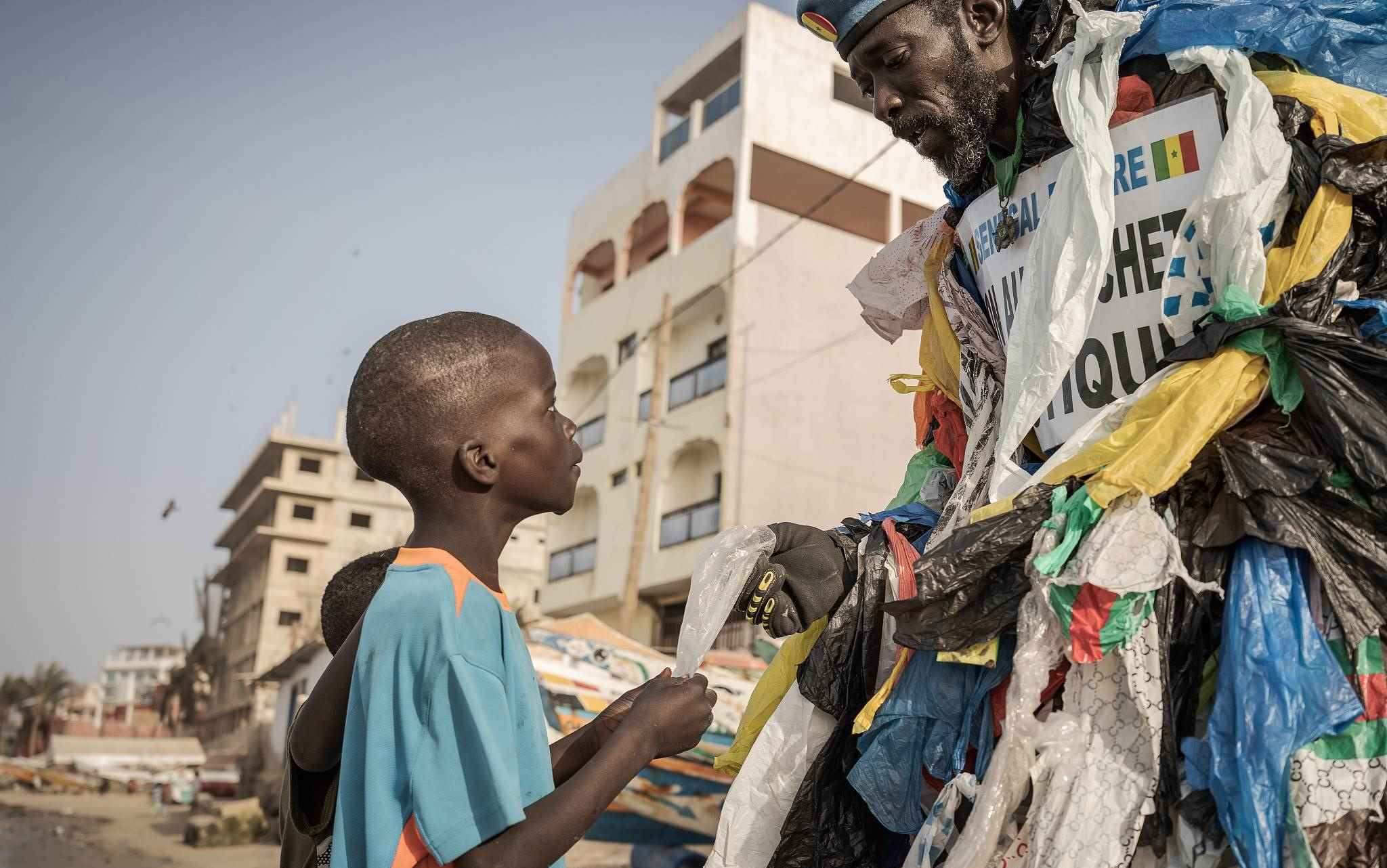 當(dāng)?shù)貢r(shí)間2023年4月5日,塞內(nèi)加爾達(dá)喀爾,49歲的塞內(nèi)加爾環(huán)?;顒?dòng)家莫杜·法爾,被稱為“塑料人”,和一個(gè)孩子在海灘上散步時(shí)拿著一個(gè)塑料包裝,提醒人們注意使用一次性塑料的污染。