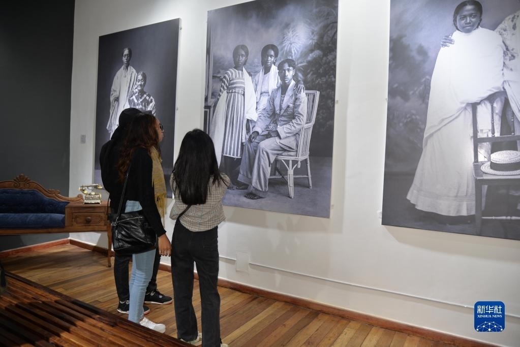 5月18日,在位于馬達加斯加首都塔那那利佛的照片博物館,當地學生參觀馬達加斯加傳統(tǒng)服飾圖片展。
