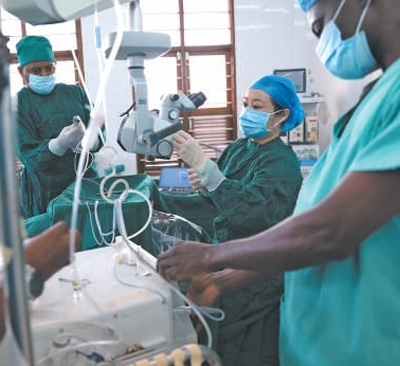 第三十二期中國援坦桑尼亞桑給巴爾醫(yī)療隊的眼科醫(yī)生與當(dāng)?shù)蒯t(yī)生一起做術(shù)前準(zhǔn)備。 新華社記者 董江輝攝