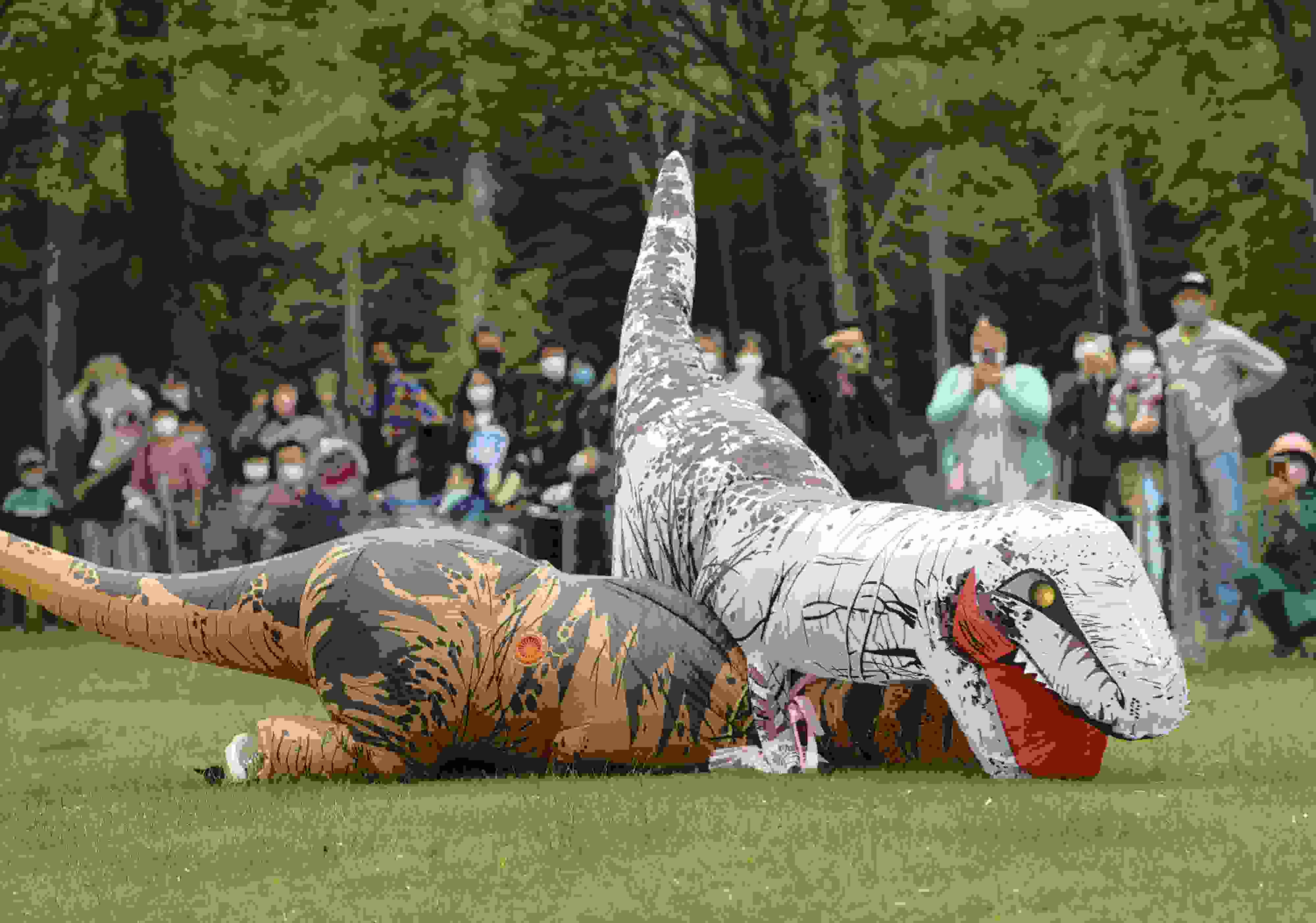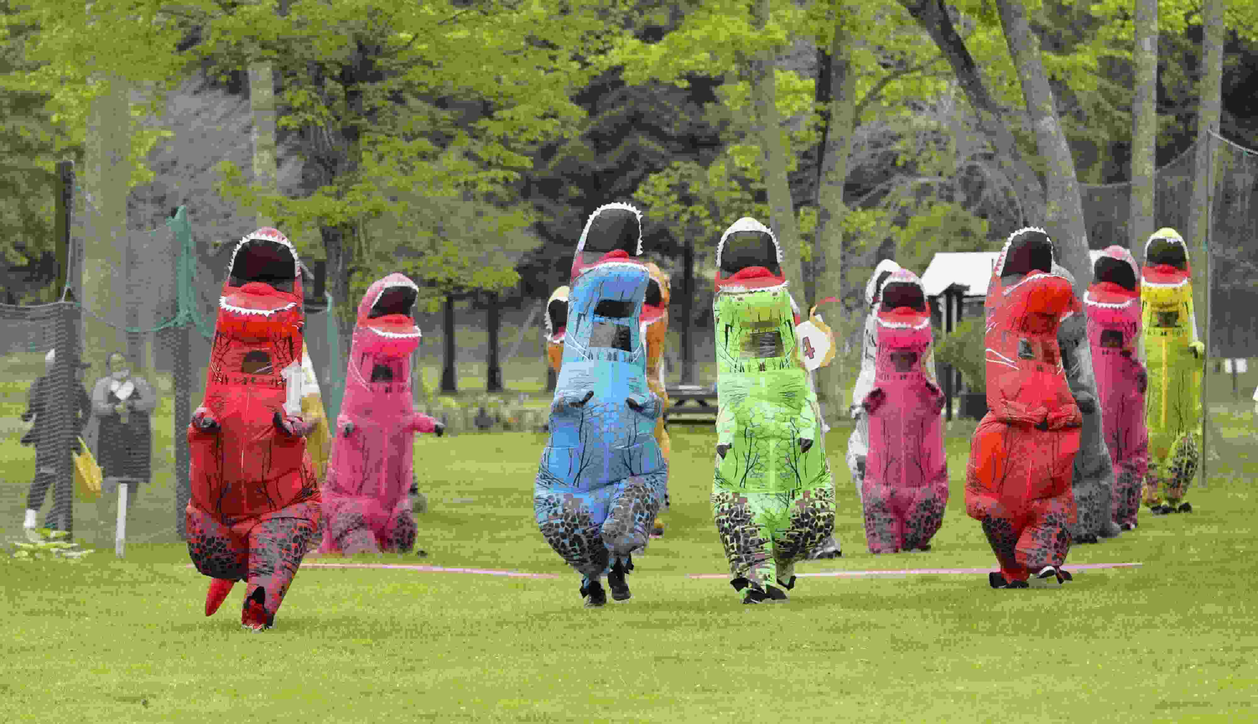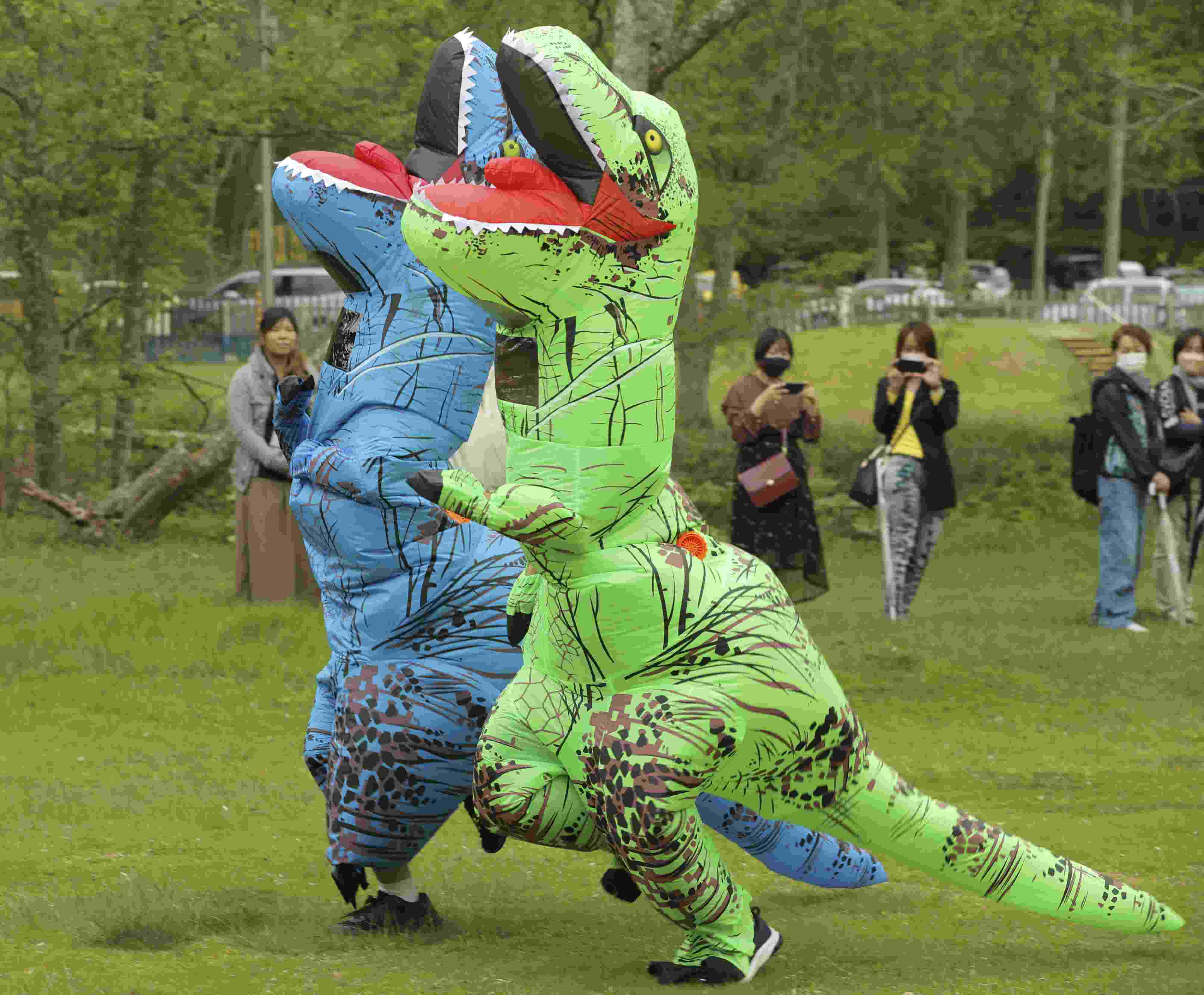 當(dāng)?shù)貢r(shí)間2023年5月28日,日本北海道苫小牧,身穿恐龍服裝的參賽者在約50米長(zhǎng)的跑道上賽跑。任何15歲以上的人都可以參加,但他們必須自己置辦恐龍服裝。 視覺中國(guó)