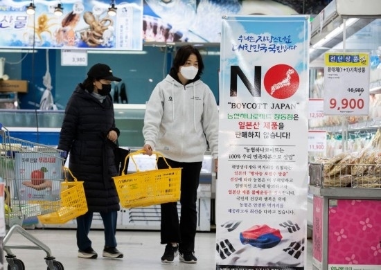 2021年4月14日,韓國首爾的一家農(nóng)協(xié)連鎖超市的水產(chǎn)商品貨架前打出“抵制日本”、“本店不銷售日本產(chǎn)產(chǎn)品”等標語,對日本政府決定將福島第一核電站核污染水排入大海表示抗議。 新華社發(fā)(徐儒錫攝)