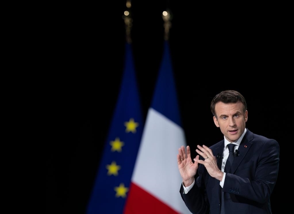 2022年3月17日,法國總統(tǒng)馬克龍在巴黎北郊塞納-圣但尼省舉行的新聞發(fā)布會上介紹競選綱領(lǐng)。新華社發(fā)(肖恩·洛朗攝)