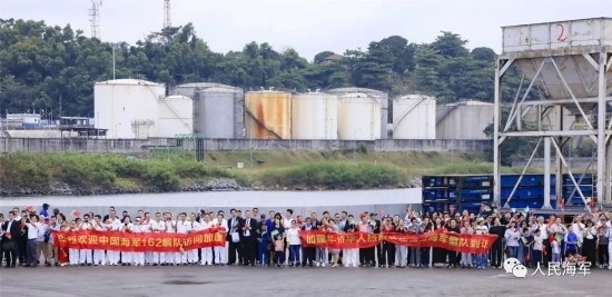 當(dāng)日上午9時,懸掛著中加兩國國旗的編隊艦艇緩緩靠泊奧文多港碼頭,中國駐加蓬大使李津津及使館工作人員、當(dāng)?shù)刂匈Y機構(gòu)人員、華人華僑代表,加蓬國防部秘書長彭吉中將及官兵代表等300余人位碼頭迎接。