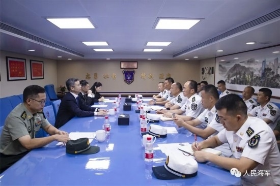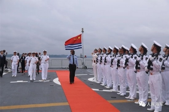 隨后,李津津大使及彭吉中將等一行人登上南寧艦進行參觀,彭吉中將在南寧艦艦長和政委的陪同下,檢閱了南寧艦儀仗隊。