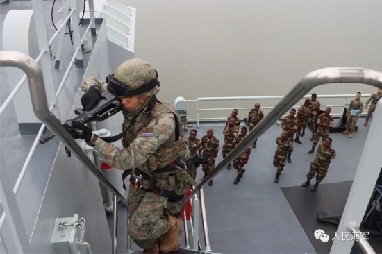 微山湖艦上,編隊特戰(zhàn)隊員向加方海軍陸戰(zhàn)隊員介紹了我特戰(zhàn)武器裝備,演示教授了滑降和艙室搜索等科目,并與加方海軍陸戰(zhàn)隊員進行了反恐反海盜、武力營救等專業(yè)交流。