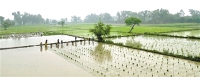 時值正午,驕陽似火。在拉合爾西南郊的一處雜交水稻試驗田里,來自中國湖南的農(nóng)業(yè)專家龍春久正在同當?shù)剞r(nóng)民和技術員一起進行雜交水稻選種試驗。頭戴草帽,褲腳挽至膝蓋,龍春久在泥濘的水田里彎腰插秧,汗水從他黝黑的面龐上淌下。